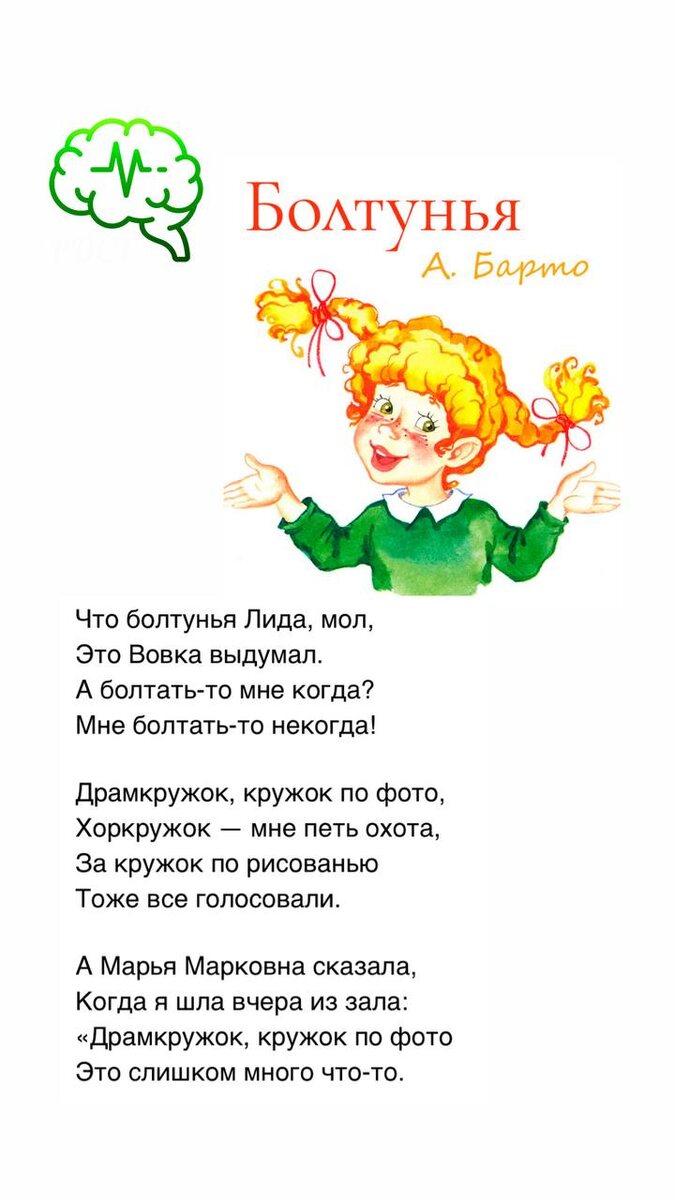 … ⠀ Все мы помним с детства шутливое стихотворение Агнии Барто «Болтунья», как смеялись над ним (публикуем на картинках для тех, кто не помнит). 🧐Но когда мы слышим на консультации от родителей, какие нагрузки у их детей, нам совсем не смешно... 😳Очень часто дошкольники и младшие школьники занимаются спортом, театром, рисованием, музыкой, английским, танцами, с репетитором, и так далее, в различных вариациях (обычно 2-3-4 одновременно). ⠀ Когда мы говорим родителям о том, что это слишком много для ребёнка, и что нужно снизить нагрузку, оставив что-то одно в дополнение к садику или школе, то, как правило, слышим в ответ: «А ему (ей) всё это нравится! Я даже не представляю, как мы сможем выбрать что-то одно!» ⠀ Отвечаем родителям: ⠀ 👦🏻 У ребёнка с нормальным интеллектом хорошо развит познавательный интерес, и не удивительно, что ему хочется узнать об окружающем мире как можно больше, многое попробовать, поэтому он с интересом и увлечением идёт на новое занятие. ⠀ Но возможнос