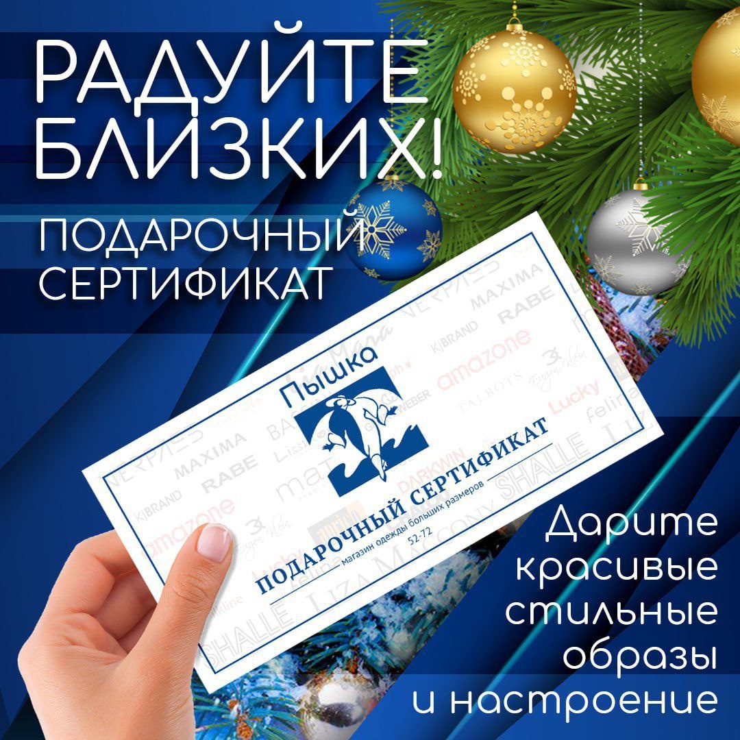 ! Подарите своим близким нечто по-настоящему ценное и незаменимое — подарочные сертификаты от «Пышки»! ❤️ У нас вы можете оформить сертификат на любую сумму от 2000 рублей, что позволяет каждому выбрать именно то, что по-настоящему подходит — от стильных обновок до эксклюзивных образов. Не упустите шанс! Подарочный сертификат — это не просто подарок, это возможность создать яркие и стильные моменты. Пора позаботиться о самых красивых подарках для любимых! 💥 Подарите стиль и хорошее настроение с «Пышкой»!