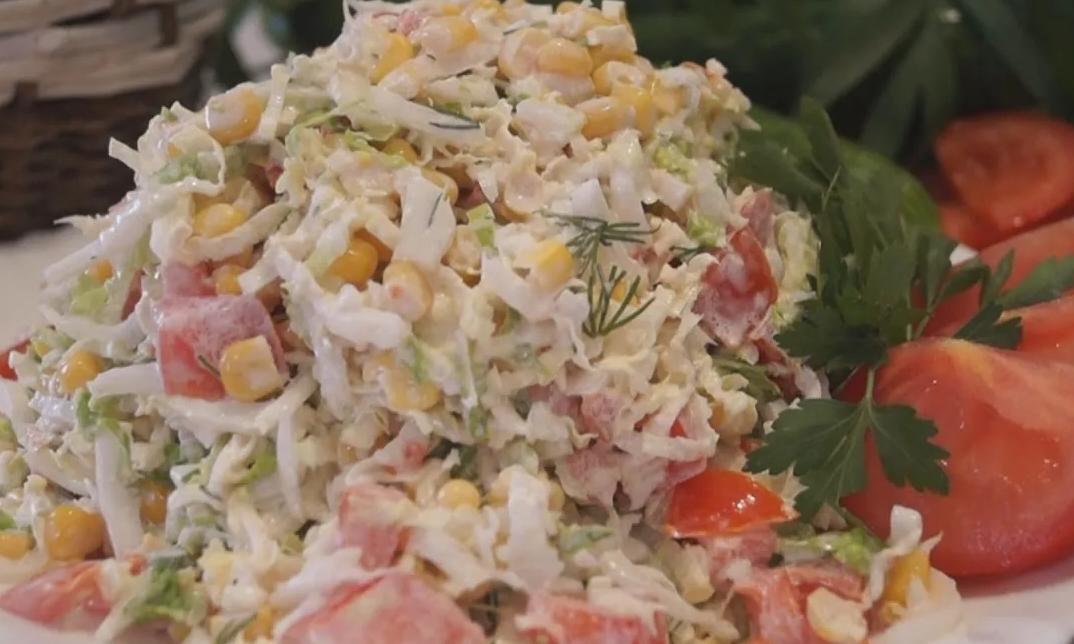 Вкусный и яркий салат из пекинской капусты с помидорами и кукурузой