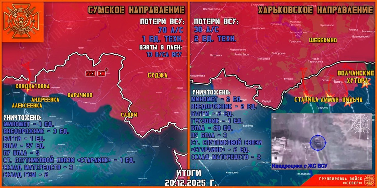 По информации сводки военкоров «Северного Ветра» на утро 21 декабря, штурмовики Северной группировки продвинулись за сутки более, чем на 1000 метров. Во время боевых действий в районе Высокого ВСУ понесли значительные потери. Бойцы РФ взяли в плен 13 военнослужащих 119 обр ТРО ВСУ, в том числе командир роты. Выяснилось, что командование запретило солдатам ВСУ покидать позиции, угрожая уничтожением дронами. Тогда всушники приняли единственно верное решение сдаться. Штурмовиков РФ поддерживают летчики и артиллеристы. Территорию врага обрабатывают «солнцепеками». - Комплексным огневым поражением бойцы РФ сорвали попытку выдвижения боевой группы 158 омбр в районе Кондратовки, - говорится в сообщении. В районе Рыжевки на Теткинском и Глушковском участках фронта российская авиация продолжала наносить удары по позициям ВСУ.