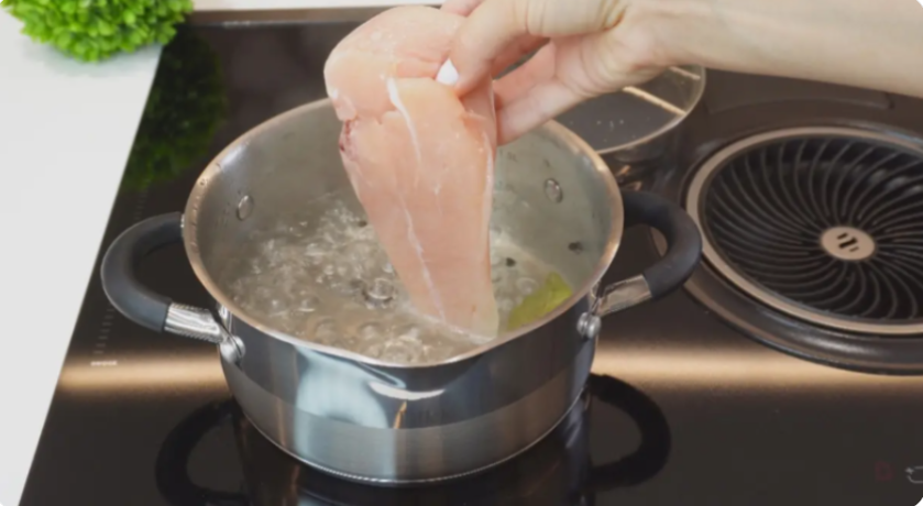 Аккуратно погрузите куриное филе в бурно кипящую воду. Вода перестанет кипеть. Дождитесь момента, когда по поверхности снова пойдут активные пузыри, и вода вот-вот закипит повторно. Сразу же выключите огонь.