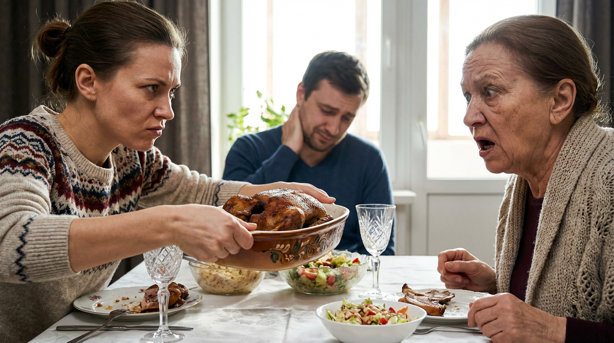 Свекровь демонстративно отодвинула тарелку с уткой на край стола, достала из своей объемной сумки пластиковый контейнер и с громким стуком поставила его на белоснежную скатерть.