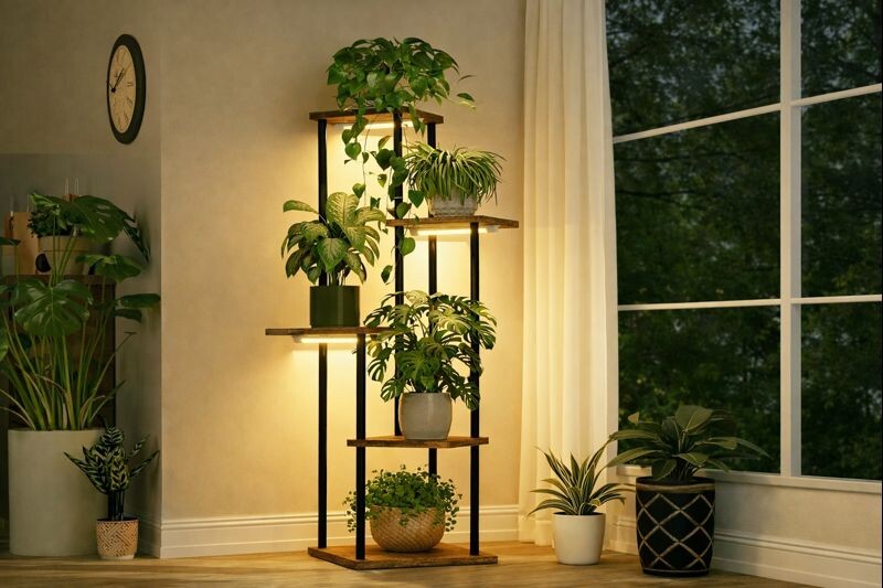 Когда растений становится больше трёх, подоконника уже не хватает. Горшки начинают стоять вразнобой: часть в тени, часть мешает шторам. В таких случаях обычно ставят не отдельные подставки, а высокий стеллаж. Эта полка сразу собирает растения в одну вертикаль. Пять ярусов — и каждый на своём уровне, без давки и перекрытия света. Металлический каркас держит форму, а деревянные полки не выглядят холодно. Подсветка решает простой вопрос: растения не зависят от окна и времени суток. Вечером полка остаётся читаемой, а зелень не проваливается в тень. Чаще всего такие стеллажи ставят у стены или в углу — там, где хочется порядок, а не хаос из горшков. Видно, что модель не случайная: у неё высокий рейтинг и уже больше сотни покупок — значит, конструкция рабочая, а не «на один сезон». 👉 Ссылку оставила здесь — посмотрите, вдруг вам тоже подойдёт Реклама. ООО «Яндекс Маркет», ИНН 9704254424