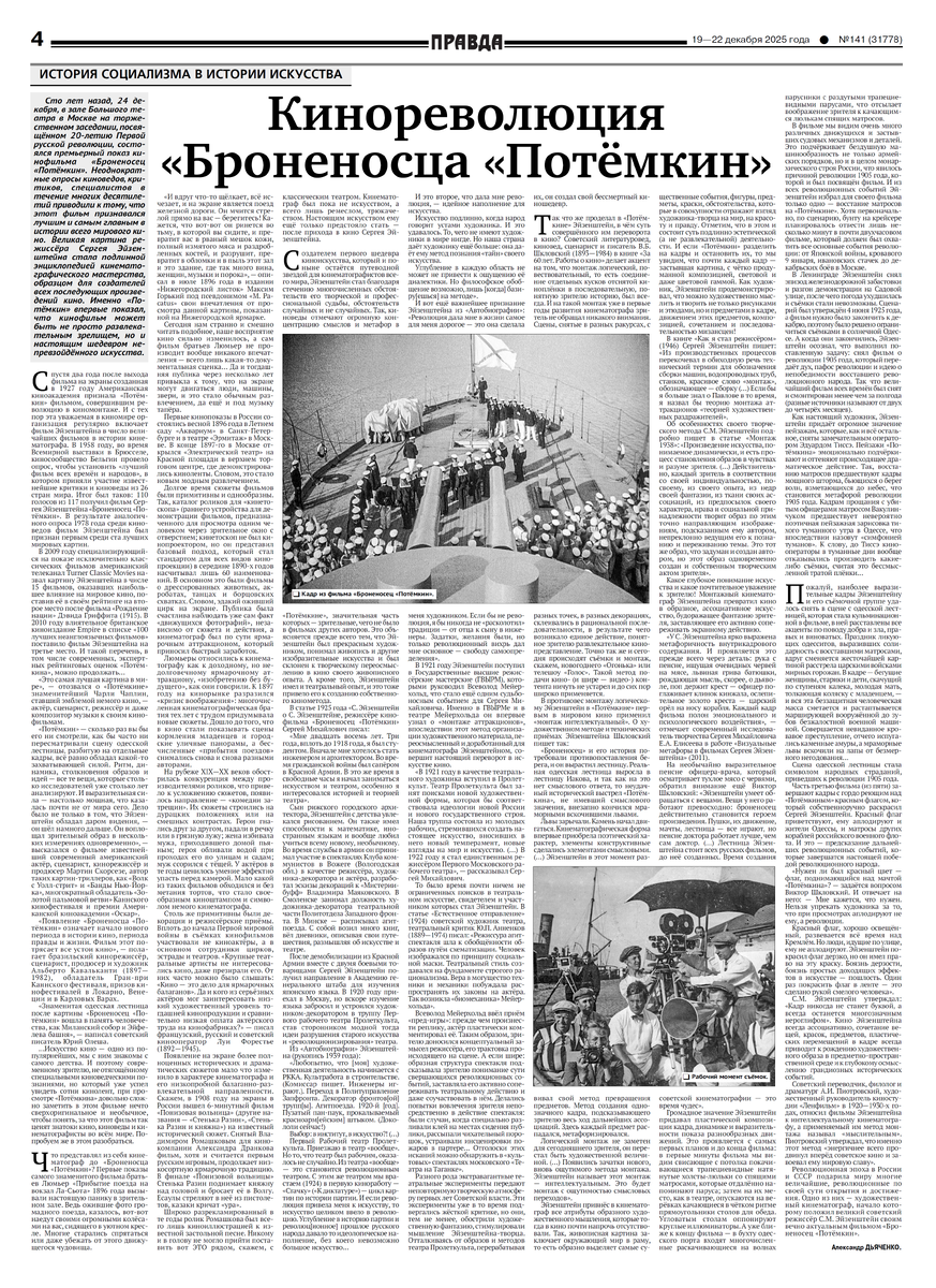 Сто лет назад, 24 декабря 1925 года, состоялась премьера фильма, навсегда изменившего мировой кинематограф. «Броненосец „Потёмкин“» режиссёра Сергея Эйзенштейна был снят к 20-летию Первой русской революции и стал её художественным манифестом — произведением, в котором эпоха революционных потрясений обрела собственный кинематографический язык. «Это самая лучшая картина в мире», — так отзывался о «Потёмкине» Чарли Чаплин, актёр, режиссёр и символ эпохи немого кино. А бразильский режиссёр Альберто Кавальканти писал: «Появление „Броненосца „Потёмкин“ означает начало нового периода в истории кино, периода правды и жизни. Фильм этот потрясает все устои кино». Почему именно эта картина, снятая за считанные месяцы, уже сто лет возглавляет списки величайших фильмов всех времён? Как революция в монтаже стала художественным отражением революционной эпохи? И в чём секрет силы сцены на одесской лестнице, вошедшей в память человечества «как Миланский собор и Эйфелева башня»? Об этом — большая статья