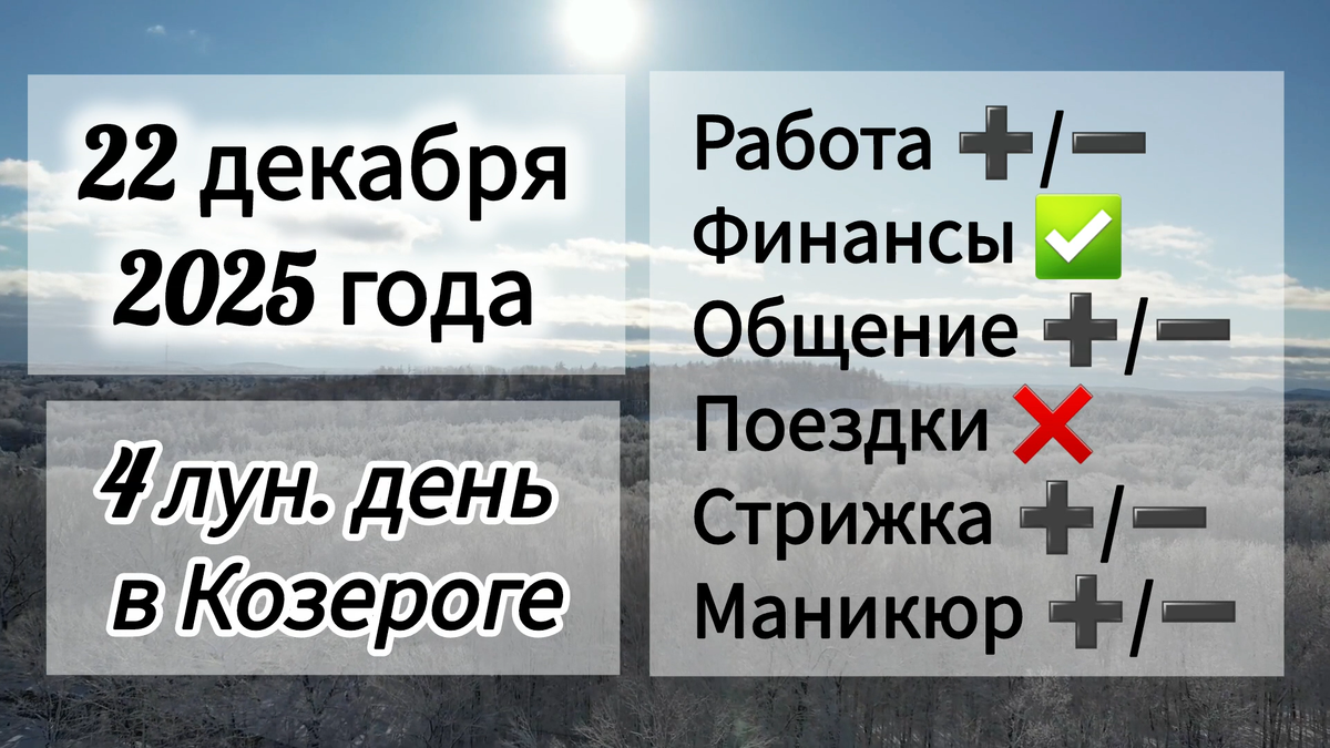 В этот день старайтесь не спешить, работайте и действуйте размеренно. Новые дела будут успешными, если их продумать заранее. Не стоит принимать в этот период поспешные решения. В любой работе лучше не брать на себя дополнительные функциональные обязанности, оценивайте свои силы реально. Благоприятный день для решения любых финансовых вопросов, кроме вопросов недвижимости. То, каким станет этот день, положительным или негативным полностью зависит от вас самих. Будьте добры к окружающим и несите позитивную жнергию. Луна в Козероге вносит в отношения временное охлаждение и снижение эмоциональности. Постарайтесь не садиться за руль, откажитесь от лишних поездок. Будьте осторожны с физическими нагрузками, тяжелой пищей и алкоголем. Повышен травматизм. В этот лунный день снятся вещие сны. Тревожные сны служат знаком предостережения.