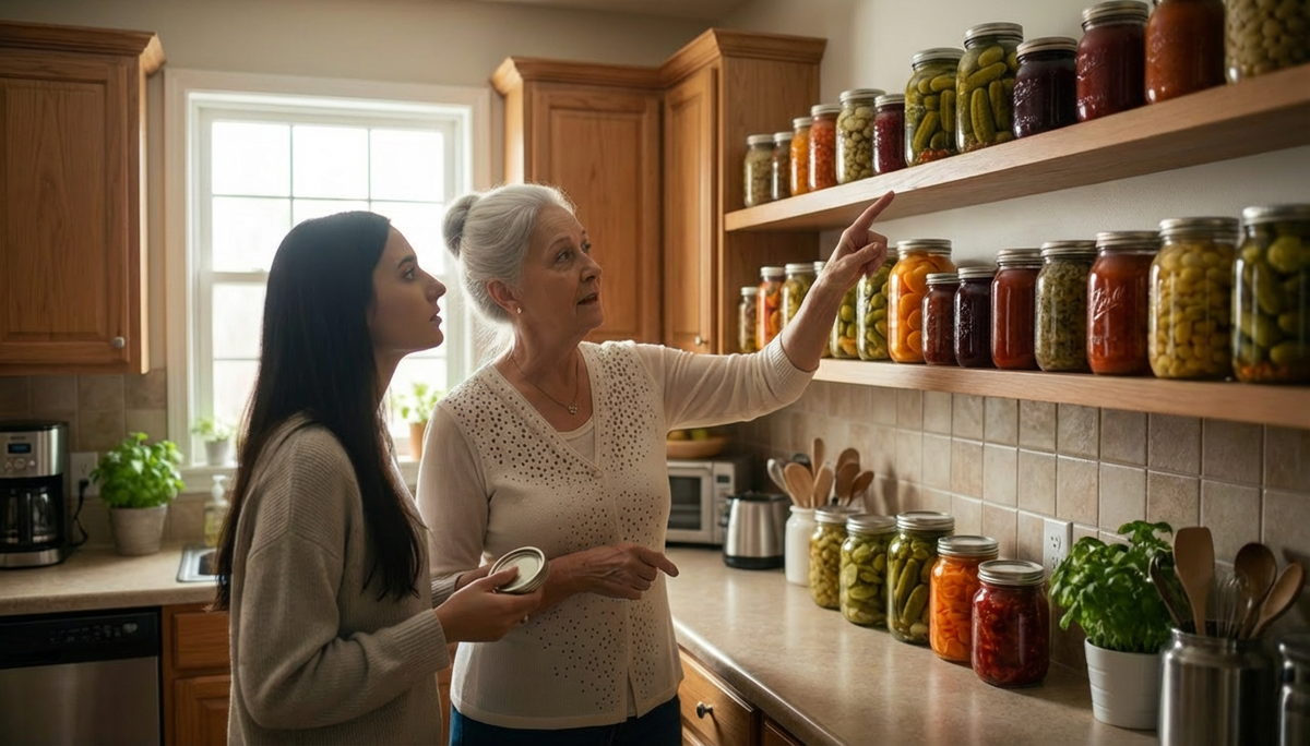 На полках — банки. Много банок. Огурцы, помидоры, что-то коричневое. Все в стекле, все с датами, написанными чёрным маркером. Календарь на стене с пометками от руки. Современная электроплита, холодильник – ему лет двадцать, но чистейший.