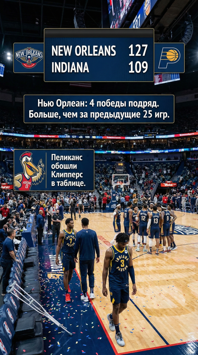 Продолжили свой вин-стрик Пеликанс против продолжающей страдать от травм Индианы. 127:109 - четвертая подряд виктория "пеликанов", настигающих в таблице перед сезоном рассматривавшихся фаворитами Клипперс.