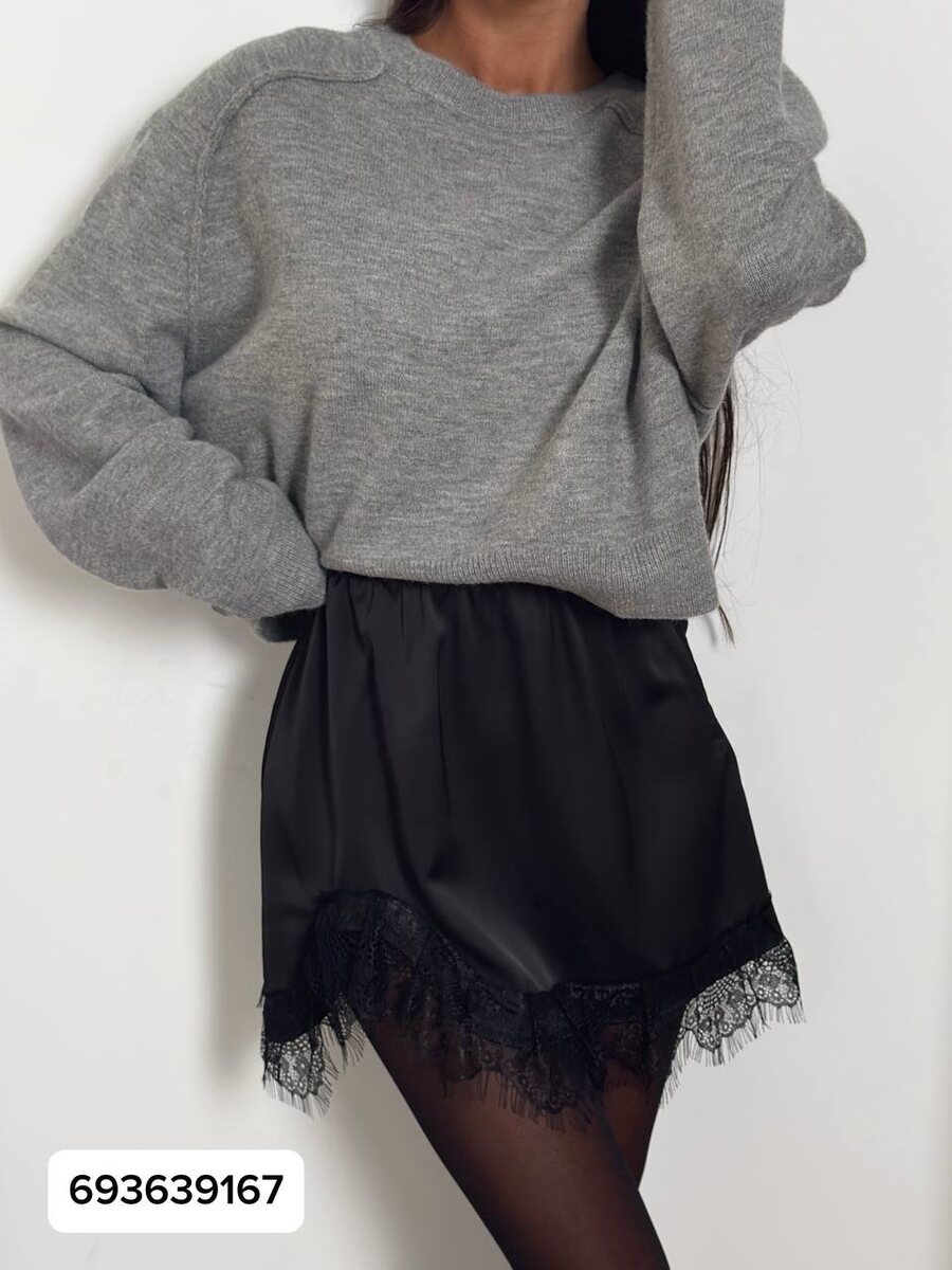Это чёрная юбка с кружевной отделкой по низу — вещь, которая работает на контрасте фактур. Гладкая ткань создаёт чистую линию, а кружево добавляет изящества и лёгкой драматичности. Такая юбка сразу делает образ «сложнее», даже если сверху самый простой серый свитер.