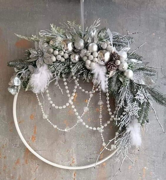 Например, деревянные пяльца или кольцо из картона, немного еловых веточек, блестящих шаров, сверкающих бусин, конечно же яркой гирлянды и вот вырисовывается очень красивый подвес или композиция на подставке, я делала нечто подобное, МК можно посмотреть ЗДЕСЬ!