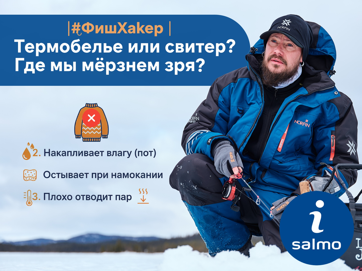 Середина декабря: идеальное время поговорить про экипировку. Мороз, ходовая рыбалка, десятки лунок… и тот самый момент, когда после активного перехода садишься на ящик и начинаешь замерзать. Знакомо? Разбираемся, почему это происходит и что с этим делать. Рыбаки делятся на два лагеря: консерваторов и сторонников современных технологий. Вышли на лёд, мороз бодрит, прошли пару километров и пробурили десяток лунок. В движении тепло, но стоит присесть на ящик, и через 20 минут начинает пробирать холод. Многие винят погоду или ветер, но причина гораздо проще — то, что надето под курткой! Шерстяной свитер действительно тёплый, пока вы сидите неподвижно. Но как только появляется активность, он начинает работать против вас. Шерсть отлично впитывает влагу, а пот на морозе - главный враг. Пока идете и бурите, всё нормально. Сели, и мокрая ткань начинает буквально вытягивать тепло из тела. В итоге вы мерзнете не от холода, а от влажности. Современное термобельё работает иначе. Его задача не греть