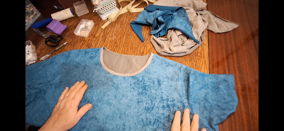 Платье я закончила. Обшила горловину, подшила рукава и низ платья. Хотела горловину обшить синей тканью, но её не хватило, обшила серой. Мне кажется-получилось нормально.