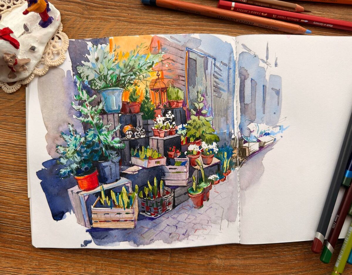 ✨ Это зарисовка одной из улочек Стокгольма перед Рождеством. Среди обычных для нас предновогодних покупок, таких как елочки и новогодние шары, здесь обязательно встречаются живые цветы. Особенно популярны волшебные луковицы Амариллиса 🌺(Amaryllis). Дома они расцветают крупными, яркими цветами красного или белого цвета. Они становятся главным украшением праздничного интерьера и радуют своим цветением в самый тёмный сезон. Гиацинты 🌸— с тонким ароматом и нежными соцветиями, они продаются с ноября и становятся традиционным выбором для декора в окна или на стол. Иногда встречаются и другие растения, которые ассоциируются с зимним уютом — например, красная пуансеттия 🌺(рождественская звезда) Почему это так важно? В Швеции рождественский сезон начинается с адвента — четырёх воскресений подготовки к Рождеству, когда в домах зажигают свечи, устраивают уютные вечера и украшают пространство, чтобы создать атмосферу тепла и света в длинные зимние дни. Живые цветы становятся частью этого ритуал