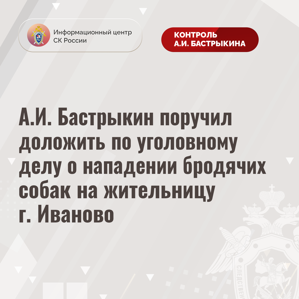 А.И. Бастрыкин поручил доложить по уголовному делу о нападении бродячих собак на жительницу г. Иваново В социальной сети сообщается, что в ноябре текущего года в городе Иваново безнадзорные собаки напали на пенсионерку. Пострадавшей потребовалась медицинская помощь. Отмечается, что на территории города обитает большое количество животных без владельцев, однако мер к организации отлова не принято. В СУ СК России по Ивановской области возбуждено уголовное дело. Председатель Следственного комитета Российской Федерации Александр Иванович Бастрыкин поручил руководителю СУ СК России по Ивановской области Дмитрию Аркадьевичу Позовскому представить доклад о предварительных и окончательных результатах расследования уголовного дела. Исполнение поручения поставлено на контроль в центральном аппарате ведомства. #СледственныйКомитет #СКРоссии #СК #ИЦСКР #ИнформационныйЦентр #АлександрБастрыкин #ПредседательСКР #КонтрольПредседателяСКР #КомментарийКонтроль #ИвановскаяОбласть