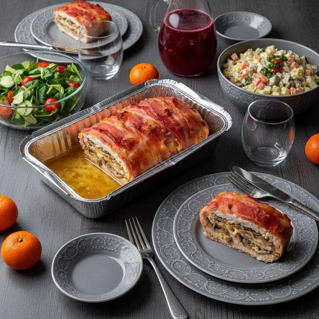 На форму объемом ~ 1 л: бекон 200 г куриное филе 2 шт( ~ 600 г) грибы ( шампиньоны у меня) - 250 г сливочный сыр 1 упаковка сыр тертый соль/ перец лук 1 шт Нарезать и обжарить лук и грибы. Куриное филе разрезать на пласты, слегка отбить, посолить и поперчить. Разложить бекон в форме для выпекания так, чтобы края свисали (ими будем закрывать начинку) Выкладываем слои: Куриное филе, смазать сливочным сыром. Сверху посыпаем натертым сыром. Выкладываем грибы. Затем повторяем слои. У меня получалось 3 слоя. Когда все слои рулета собраны, закрыть его беконом. Выпекаем в разогретой до 180 С духовке 40 -50 минут ( учитывайте способности своей духовки). Такой рулет на праздничном столе будет кстати)