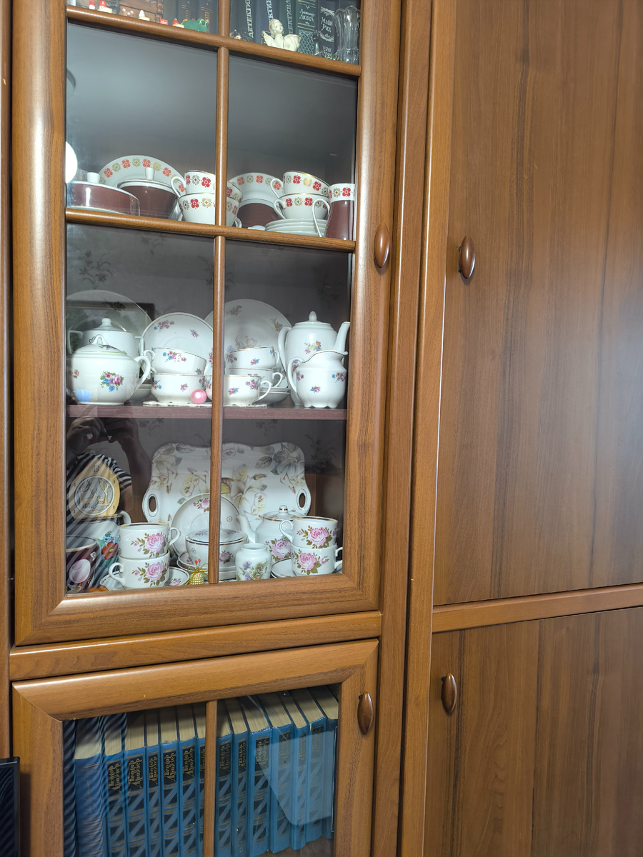 Рада снова вас приветствовать на моем канале. Сегодня, выходные на улице мороз до -28 градусов и ветер, ни куда не едем и не идём, внуки дома сидят. Решила навести небольшой порядок в "фарфоровом царстве", хочу упорядочить кое - что на полках в шкафу. Не знаю ещё? Что куда пойдет, что - то вообще убрать, книги сдвинуть и центральные местами займут мои "сокровища". Как -то так, вот что получилось. И так начну на самом верху остались книги и так мелочь всякая, не в счёт. Буду считать на верхней полке разместила сервиз из белого фарфора, с коричневым крытьем и красно - золотым орнаментом. Это Фрайбургский фарфор из Саксонии (ГДР). На средней полочке с вверху у меня стоят предметы сервиза в стиле "русский ситчик" и тарелки с декором "мейсенский букет". Производства разных фарфоровых заводов, все уже приличного возраста. На нижней полочке сервиз украшенный по бокам красивыми розовыми розами с золотой обводкой по контуру. Плюс кружка "Весна" больше известная как "слива на красном".