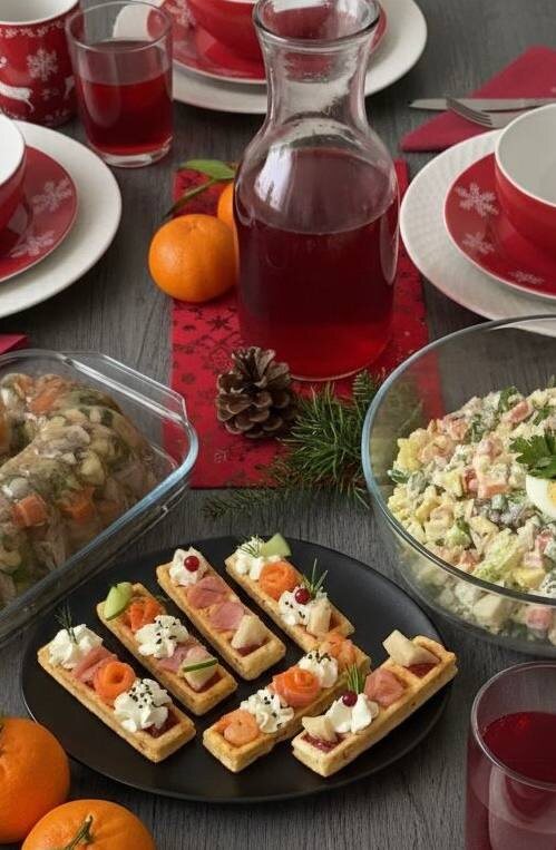 Ой, смотрите какая закуска интересная! Себе сохранила и с вами делюсь 😊 Новогодняя закуска на сырных вафлях Тесто: Яйцо 2 шт Молоко 100 мл Мука 120 г Сыр 100 г Разрыхлитель, соль по 1/2 ч.л Всё соединить, испечь вафли. Начинка: Креветки, рыба, огурец, творожный сыр, сыровяленое мясо, брусничный соус, твердый пармезан. Как вам такое?