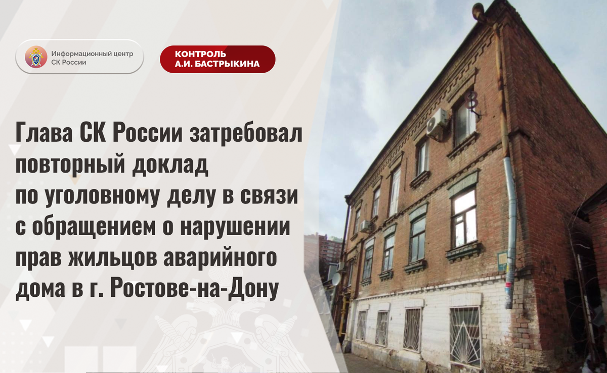 Глава СК России затребовал повторный доклад по уголовному делу в связи с обращением о нарушении прав жильцов аварийного дома в г. Ростове-на-Дону В приёмную Председателя СК России А.И. Бастрыкина в социальной сети «ВКонтакте» обратилась жительница города Ростова-на-Дону по вопросу несогласия с ходом установления обстоятельств длительного нерасселения жильцов многоквартирного дома на улице Максима Горького. В 2004 году часть жилых помещений в здании 1917 года постройки признана аварийными. Вместе с тем аналогичный статус всему строению присвоен лишь в 2018 году после многочисленных обращений жильцов в различные инстанции. При этом граждане, занимавшие муниципальные квартиры, переселены в иное благоустроенное жилье, а собственники жилых помещений продолжают пребывать в небезопасных условиях. До настоящего времени никто к ответственности не привлечен. В СУ СК России по Ростовской области расследуется уголовное дело, возбужденное по поручению А.И. Бастрыкина. Председатель Следственного ко