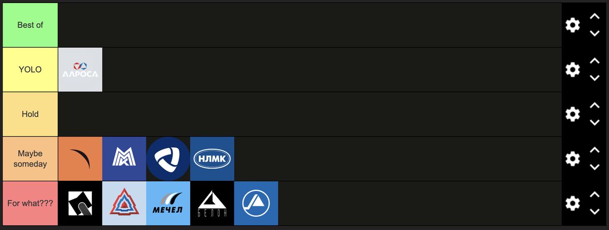 Коллеги, всем привет! В этом канале мы уже успели рассмотреть основные принципы долгосрочного инвестирования и разобрали перспективность некоторых рынков. Пришло время сделать очередной шаг вперед - составить тир-лист этих акций. Небольшое предисловие: Тир-лист (англ. tier list - список уровней) - это рейтинговая система, которая состоит из нескольких уровней. Тир лист используется для оценки чего угодно от лучшего к худшему. В нашем случае будет составлен тир-лист российских акций. Это не инвестиционная рекомендация, это фреймворк (рабочий подход), который позволит нам более-менее объективно подойти к вопросу оценки бумаг + визуализировать итоговую картину. Наш рейтинг состоит из следующих уровней: Итак, приступим по порядку: 1. АЛРОСА. Если мои догадки из предыдущего поста верны, то АЛРОСА сейчас - это одна из наиболее недооцененных компаний. Существует не малая вероятность, что цены на алмазы упали вовсе не из-за появления на рынке искусственных алмазов, а из-за санкций на Россию и