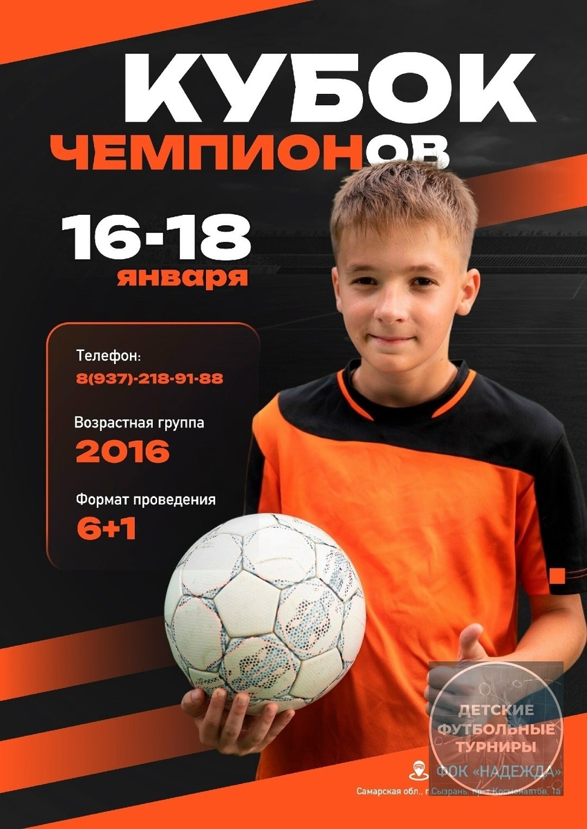 Приглашаем всех желающих принять участие в нашем грандиозном турнире Кубок Чемпионов! Это будет незабываемое событие, полное ярких эмоций, азарта и новых друзей Коротко о главном 2016 г.р. формат - 6+1 2 тайма по 20 минут фотоотчет прямые трансляции музыкальное сопровождение полная статистика на нашем сайте классные призы и подарки для всех участников Сызрань, манеж ФОК «Надежда» Состав участников: 1. Сатурн (Сызрань) 2. Спартак Юниор (Николаевка) 3. Спартак (Сызрань) 4. Галактикос (Тольятти) 5. Сызрань-2003 синие (Сызрань) 6. Гагарин (Энгельс) 7. Сызрань-2003 белые (Сызрань) 8. Олимп (Чапаевск) 9-16 - свободно Вместе сделаем этот турнир незабываемым и заряженным футбольным адреналином Подробная информация и регистрация участников по телефону: +7 937-218-91-88 (Александр Сергеевич) --- #ФутбольныйТурнирЯнварь2026 #ФутбольныйТурнирЦентральнаяРоссия2026 #ФутбольныйТурнирСызрань2026 #ФутбольныйТурнирСызрань2016гр