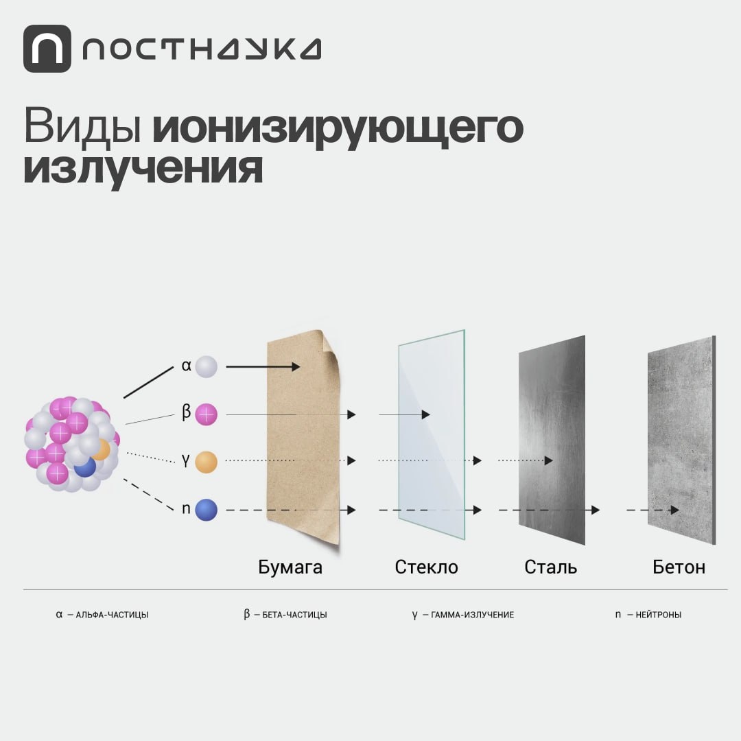 На схеме — виды ионизирующего излучения с разной проникающей способностью.