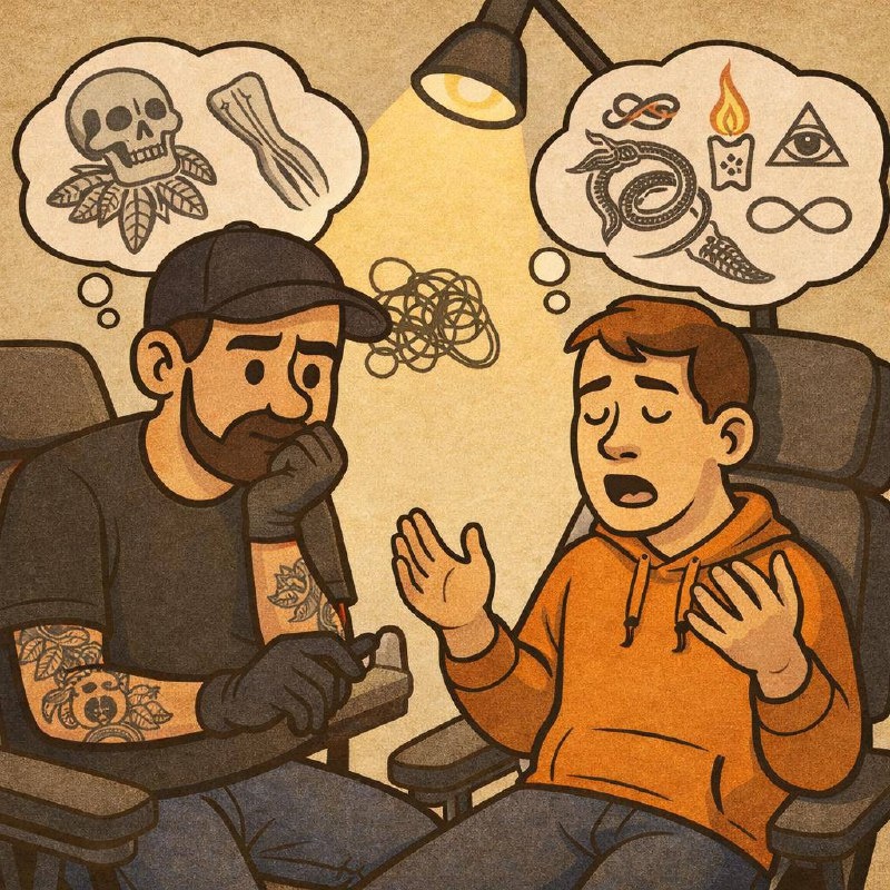 По паузе, по интонации, по тому, как человек подбирает слова. Обычно за философскими формулировками скрывается не символ, а состояние — пережитый период, потеря, злость, желание зафиксировать точку, после которой «я уже другой». Мастер в этот момент не думает про высокие материи. Он думает, как перевести это на язык кожи так, чтобы через годы это не превратилось в визуальный мусор. Пока клиент рассказывает про перерождение, энергию и путь, в голове мастера крутятся совсем другие вещи: анатомия, движение тела, плотность линий, как это состарится, не развалится ли смысл вместе с формой. Потому что смысл можно объяснить словами, а татуировка будет говорить сама — без пояснительной записки. И если форма слабая, никакая философия её не спасёт. Самый сложный момент — баланс. Нельзя обесценить переживание человека, но и нельзя бездумно переносить всё, что он придумал. Иногда лучший профессиональный поступок — аккуратно сократить идею, упростить, убрать лишнее. Не потому что мастер «умнее»,