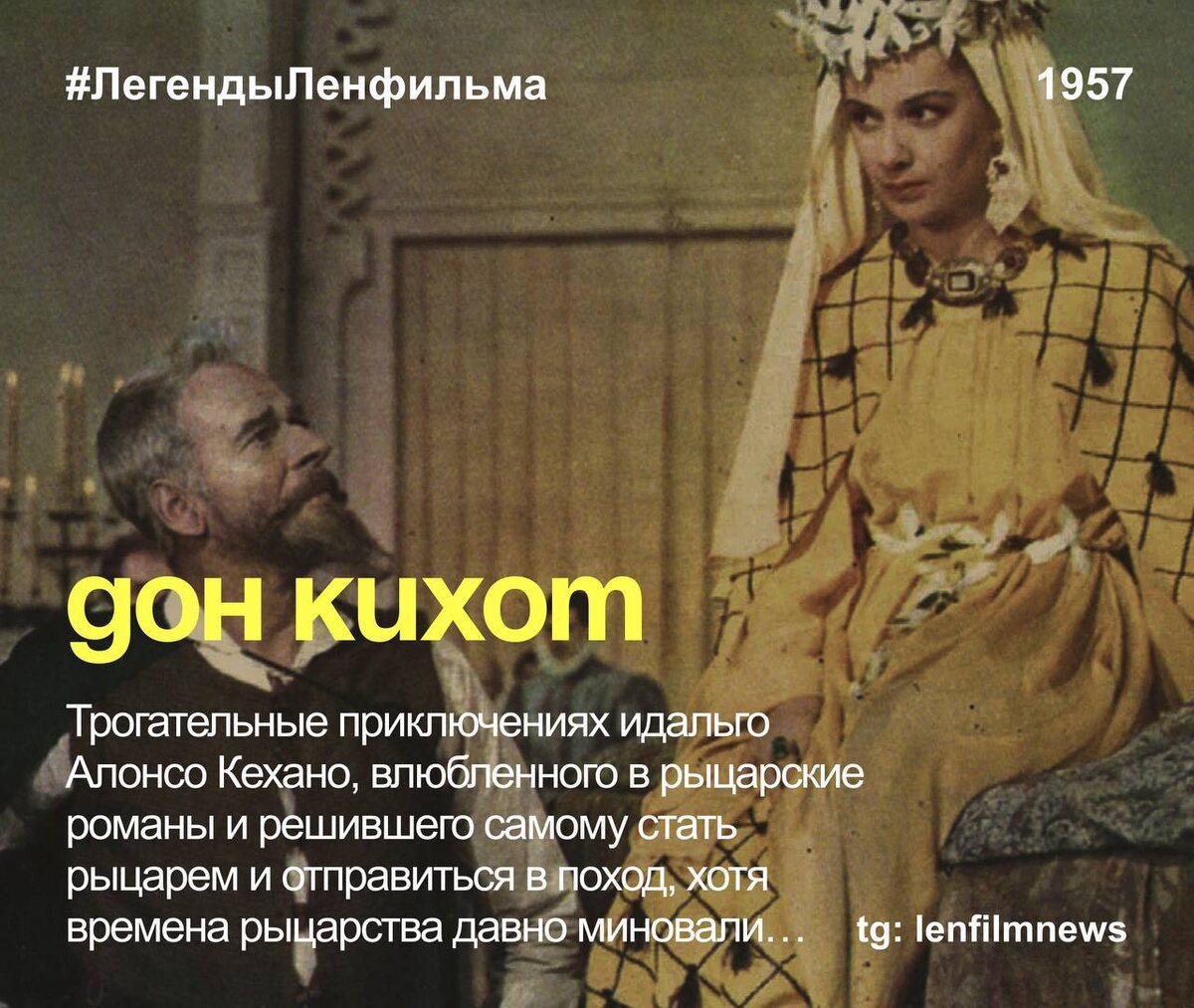 ) Сценарий фильма был создан Евгением Шварцем по мотивам романа Мигеля де Сервантеса «Дон Кихот». Картина, как и книга, рассказывает о забавных и трогательных приключениях идальго Алонсо Кехано, влюбленного в рыцарские романы и решившего самому сделаться рыцарем и отправиться в поход, хотя времена рыцарства давно миновали… Когда в 1957 году фильм вышел на экраны, он завоевал популярность не только у советского зрителя, но и на родине Сервантеса! ☺️ Испанские зрители, увидев на кинофестивале козинцевского «Дон Кихота», сказали, что версия советского режиссера - «Самая «испанская» из всех, что мы только видели» 🏆Лента была оценена и критиками: Григорий Козинцев был удостоен почетным дипломом на Международном кинофестивале в Ванкувере, Канада. #ЛегендыЛенфильма