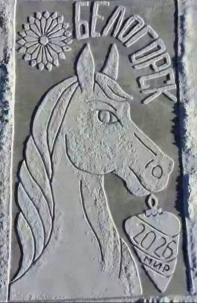 Получилась размером 1 500 кв. м. И это несмотря на перелом ноги, который случился у него в августе. До этого Евгений Абрамич получил тяжелое ранение, ему пришлось перенести долгую реабилитацию и установить железные спицы в ногу. Мысль об открытке помогла амурчанину быстро восстановиться. «В одной руке трость, в другой — лопата. Это уже как зависимость — создавать чудо на льду», — говорит Евгений. Новая работа — уже пятая по счету для фестиваля «Чудеса на льду» от художника-импровизатора. Работал он над ней четыре дня. После первого выпавший снег весь рисунок закрыл. Рисовал без готового эскиза, ориентируясь только на картинку в телефоне и свой внутренний план. Инструменты — простая лопата, санки и корыто. В этом году Евгения вдохновила лошадь по имени Мирабель — символ года и движения вперёд. Вместе с женой художник дописал на новогодней игрушке в её зубах заветное слово «мир». Это его главное пожелание россиянам в 2026 году.