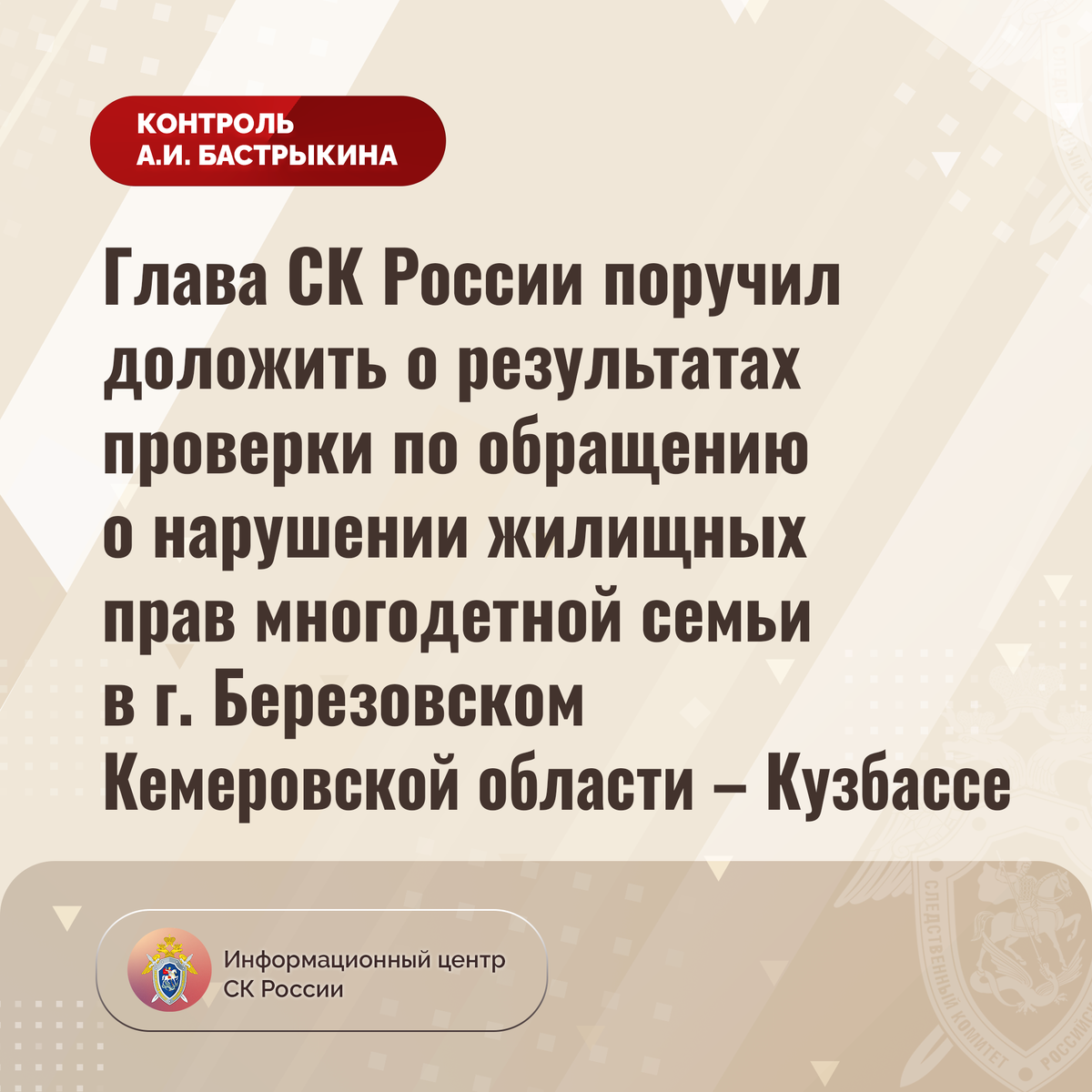 Глава СК России поручил доложить о результатах проверки по обращению о нарушении жилищных прав многодетной семьи в г. Березовском