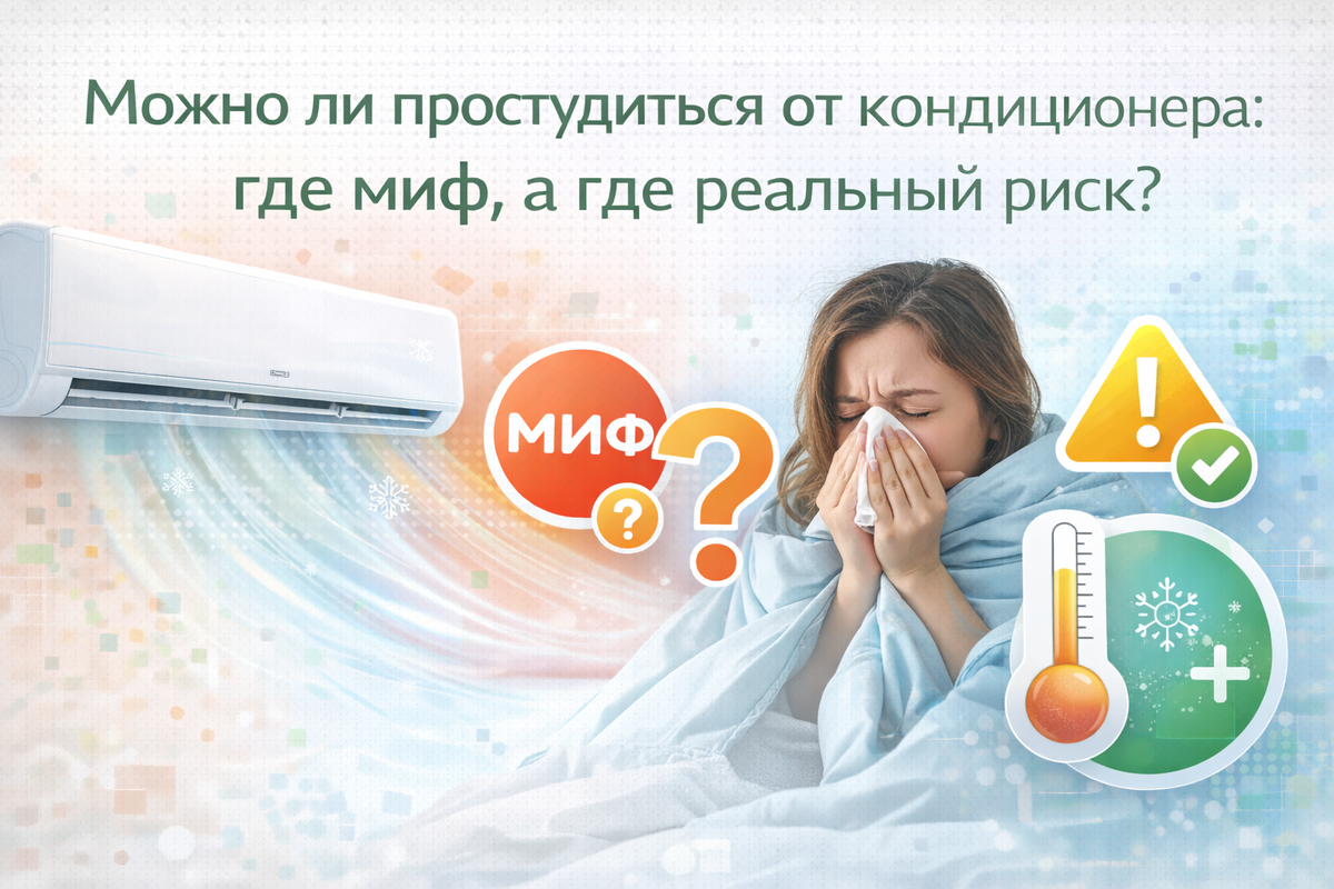 Простуда — это вирусы и переохлаждение организма, а не холодный воздух как таковой. Кондиционер лишь создаёт условия, при которых риск может вырасти.