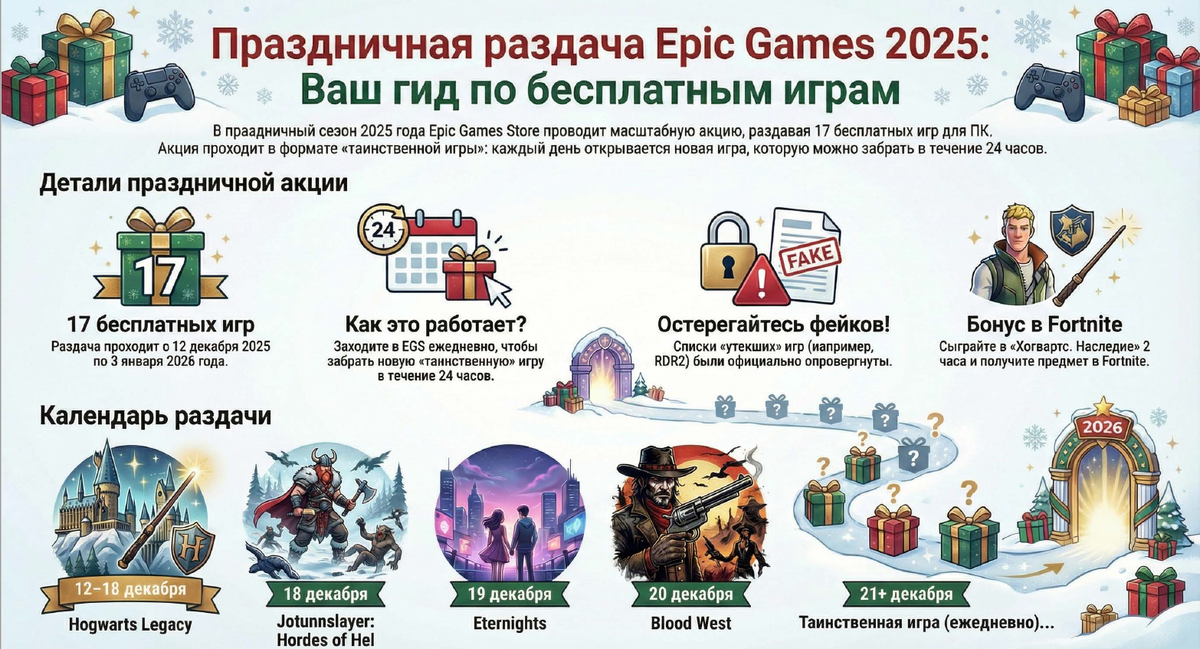Каждый год в декабре игровое сообщество замирает в ожидании. Не из-за снега за окном, а из-за «цифрового снегопада» подарков от Epic Games Store. Праздничная раздача 2025 года — не просто акция, это грандиозное шоу щедрости, стратегический ход гиганта индустрии и настоящий праздник для миллионов. Epic Games не просто дарит игры — она запускает марафон, где первым же подарком оглушает всех: легендарная Hogwarts Legacy становится бесплатной. Это громкое заявление, после которого уже нельзя пройти мимо. Всего же в рамках акции с 12 декабря по 3 января обещано 17 полноценных игр. Для русскоязычной аудитории это шанс бесплатно пополнить библиотеку проектами, на которые раньше, возможно, не хватало бюджета или смелости. В этом гиде — полная картина происходящего: от ежедневного графика до ответа на главный вопрос: «Как Epic Games это вообще выгодно?».