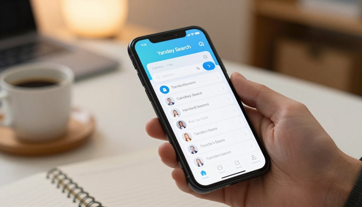 Создайте детальное изображение интерфейса поискового приложения Яндекс на современном смартфоне. На переднем плане покажите смартфон с элегантным стеклянным корпусом, на котором prominently отображается строка поиска Яндекс и подборка результатов поиска по различным темам. На среднем слое должна быть изображена рука пользователя в деловом костюме, использующего приложение с сосредоточенным выражением лица. На заднем плане изобразите мягкую, размытую офисную обстановку с минималистичным декором, создающую ощущение продуктивной атмосферы. Используйте яркое естественное освещение для повышения четкости и создания бодрого настроения. Угол обзора должен быть слегка наклонен, чтобы обеспечить динамичное отображение экрана, подчеркивая удобство использования и доступность в дизайне приложения.