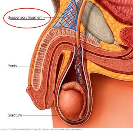 suspensory (отмечена на изображении), методика позволят выдвинуть скрытую часть пещеристых тел полового члена. Сегодня нам удалось достичь +3 см, в дальнейшем пациент будет использовать экстендер, что может еще добавить несколько см.
