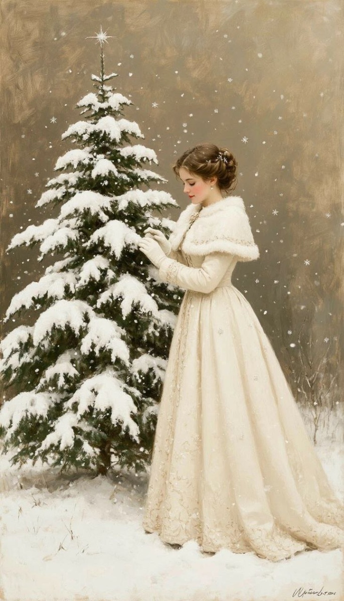 Зимняя коллекция винтажных портретов: изящные девушки в белых платьях и шубках у ёлок, атмосфера новогоднего бала, снега и тихой рождественской сказки.