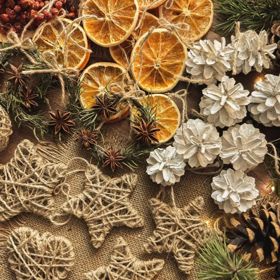 Первое и, пожалуй, самое классическое украшение для натурального новогоднего декора — это засушенные апельсиновые дольки. Они не только выглядят эффектно благодаря тёплому, прозрачному сиянию, но и наполняют дом невероятным цитрусовым ароматом.