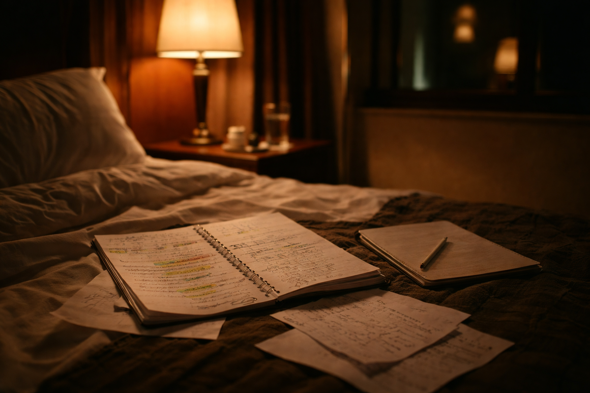 Номер в отеле освещён настольной лампой. На кровати разложен сценарий, страницы исписаны карандашом, слова обведены, рядом стрелки, пометки на полях. В углу стоит зеркало, в нём отражается лицо, которое уже не совсем его. Хит сидит на краю кровати, читает реплики вслух, останавливается, пробует интонацию ещё раз. Он работает не потому, что надо. Он работает потому, что иначе не получается. Роль не остаётся в папке. Она ночует с ним в одной комнате.