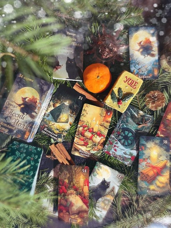 🧡🙏 Колода создана Светланой Астер, автором ещё одного чудесного творения по Колесу Года – оракула Сказки Самайна. Здесь же нас ждут образы, символы и магия Йоля: йольский кот, кабан, козёл, йольское полено, йольский светильник, духи ночей Йоля, старуха, штоллен и многое другое🎁 🎄 Я думаю сегодня после прожига мы будем смотреть послания духов именно на этой колоде, вы не против?
