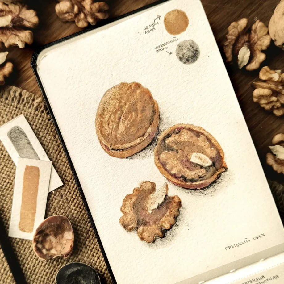 Мир натуральных красок удивляет тем, насколько знакомые нам материалы могут превращаться в выразительные, глубокие оттенки. Одним из самых доступных и волшебных растительных пигментов остаётся… обычная луковая шелуха. Она кажется таким простой кухонной вещью, но стоит только попробовать сделать из неё краску — и перед вами открывается целый мир тёплых, земляных оттенков: от золотистых и янтарных до насыщенных коричневых. В этой статье я расскажу, как приготовить натуральную краску из шелухи лука, какие оттенки можно получить, а также покажу, как я нарисовала грецкий орех, используя всего один пигмент. Луковая шелуха содержит множество природных красителей — прежде всего кверцетин и его производные. Это устойчивые флавоноиды, которые прекрасно растворяются в горячей воде и дают глубокие, стабильные оттенки. В отличие от “капризных” антоцианов, пигменты шелухи не меняют цвет от pH и славятся своей хорошей светостойкостью. Чтобы получить пигмент, достаточно залить шелуху водой и прогреть