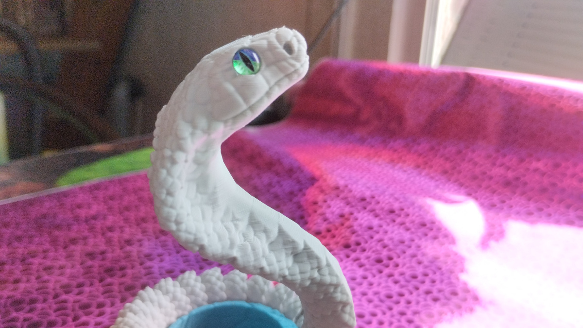 Функциональная, основная часть - тело карандашницы - стакан, имеет внутреннюю цилиндрическую полость. По наружности спроектирован спиралевидный желоб. Декоративная часть - звеньевая змея, может использоваться как игрушка. Количество деталей Стакан - 1шт. Кобра звеньевая - 96 шт., 95 их которых - это звенья тела, 96-я - это голова, переходящая в шейный отдел. С внешней стороны стакана, спиральный желоб для расположения по нему звеньевой кобры. Материал Сама Кобра выполнена из полилактозы PLA MATTE ESUN Тело карандашницы тоже из полилактозы PLA MATTE ESUN Цвет Кобра - Радуга-радуга - rainbow Стакан - Океан-ocean rainbow Время печати кобра - 18 часов, стакан - 10 часов. Принтер Creality Ender 3 V3 KE Декор Стеклянные глаза д. 6 мм в цвет. Метод крепления - клеевой. Антураж Бархат для фона любезно предоставлен моим двигателем прогресса )) Коллаж из трёх фото - оба изделия в действии Важное примечание - в обоих изделиях НОЛЬ постобработки. Спасибо за прочтение. Я по-прежнему 3Д печ