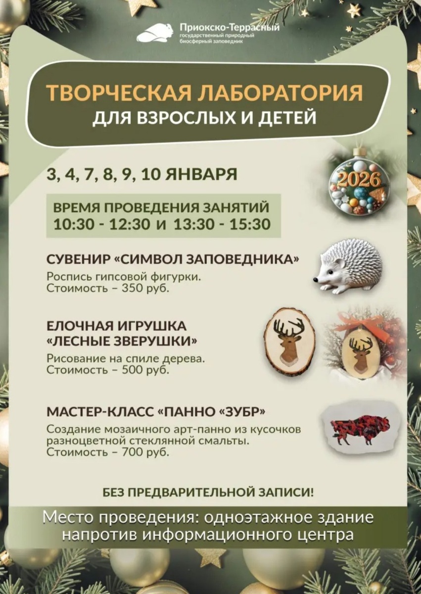 ✨ Приокско-Террасный заповедник приглашает в гости 🦬 ❄️ 2-12 января работаем каждый день, чтобы вы могли получить свою порцию свежего воздуха, позитивных эмоций 😉 Ежедневно с 9 до 16 часов в формате экскурсии или квеста. 3, 4, 7, 8, 9, 10 января с 10:30 до 12:30 и с 13:30 до 15:30 будет работать Творческая мастерская (регистрация обязательна) 💫И ещё много всего интересного Записаться и подробнее тут 👉https://clck.ru/3QuPoC 🚫 Возраст: 0+ 🏢 Приокско-Террасный природный заповедник 📍 г.о. Серпухов, местечко Данки ⭐Поддержать канал голосом 💰 Канал Вакансии Серпухова ✅ Мероприятия Серпухов https://dzen.ru/id/66f01c6eb4c6fe60c9ca1608 http://vk.com/serpukhov_events http://dzen.ru/serpukhov_events