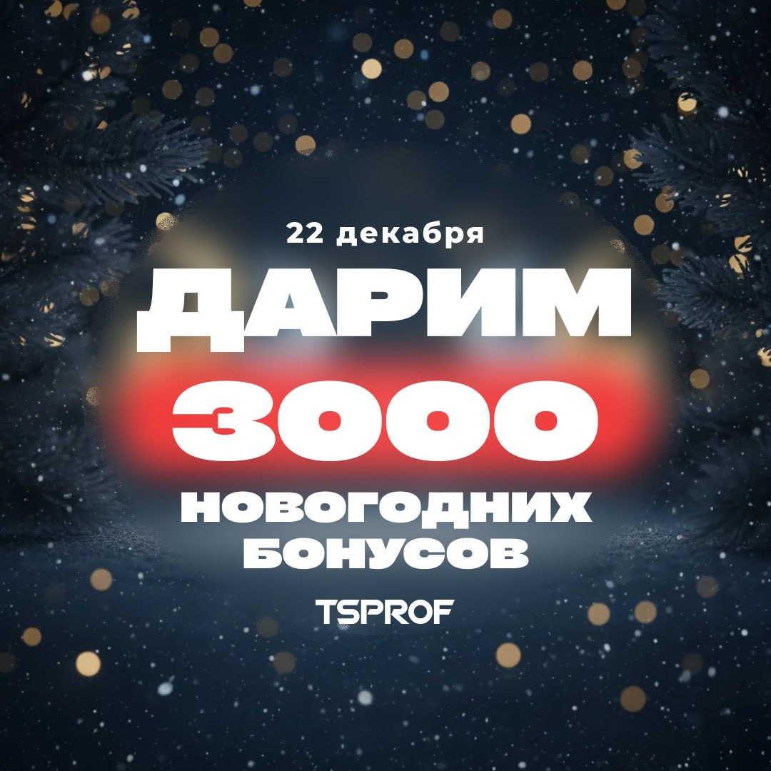 ] 🎄22 декабря TSPROF подарит 3000 новогодних бонусов на заказы! Если вы еще не зарегистрировались на сайте tsprof.ru успевайте до 22 декабря, чтобы не упустить их. Бонусы будут активны 3 дня и сгорят 25 декабря, поэтому успейте потратить и сделать выгодные покупки: ➡️ Оплачивайте до 50% заказа бонусами — сократите его стоимость вдвое! ➡️ Покупайте по текущим ценам, зафиксируйте выгоду сейчас. ➡️ Получите бесплатную доставку на заказы от 10 000 ₽ (действует до 31 декабря). А также прокачивайте вашу постоянную выгоду: ✅ Прямые поставки от производителя = лучшие цены. ✅ Персональная скидка и кешбэк, которые растут с каждым заказом. Важно! Бонусы придут только зарегистрированным пользователям. Успейте зарегистрироваться до 22 декабря.
