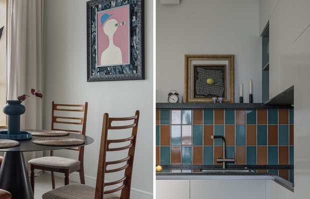 Контрастная плитка, картина с лимоном и коврик из Стамбула — здесь есть все, чтобы готовить с удовольствием Когда дизайнер Лилия Асфандиярова проектировала эту 97-метровую квартиру в Уфе для своей семьи, кухня стала одним из самых продуманных пространств. Хозяйка сознательно отказалась от модного формата кухни-гостиной, решив вынести кухню в отдельное помещение. В этом решении прослеживается и забота о комфорте, и попытка сохранить тишину в зонах отдыха. Помещение кухни оказалось скромным по площади, поэтому дизайнер использовала каждый сантиметр рационально, при этом ей удалось сохранить ощущение легкости за счет цвета, отделки и отсутствия лишнего. Чтобы кухня не казалась тесной, Лилия отказалась от стандартных навесных шкафов: вместо них аккуратная полка из искусственного камня по длине стены. На ней — утренние бокалы, подсвечники и живописный акцент: картина Василия Ханнанова «Второй лимон». Фартук облицован выразительной плиткой терракотового и бирюзового оттенков: решение сразу з