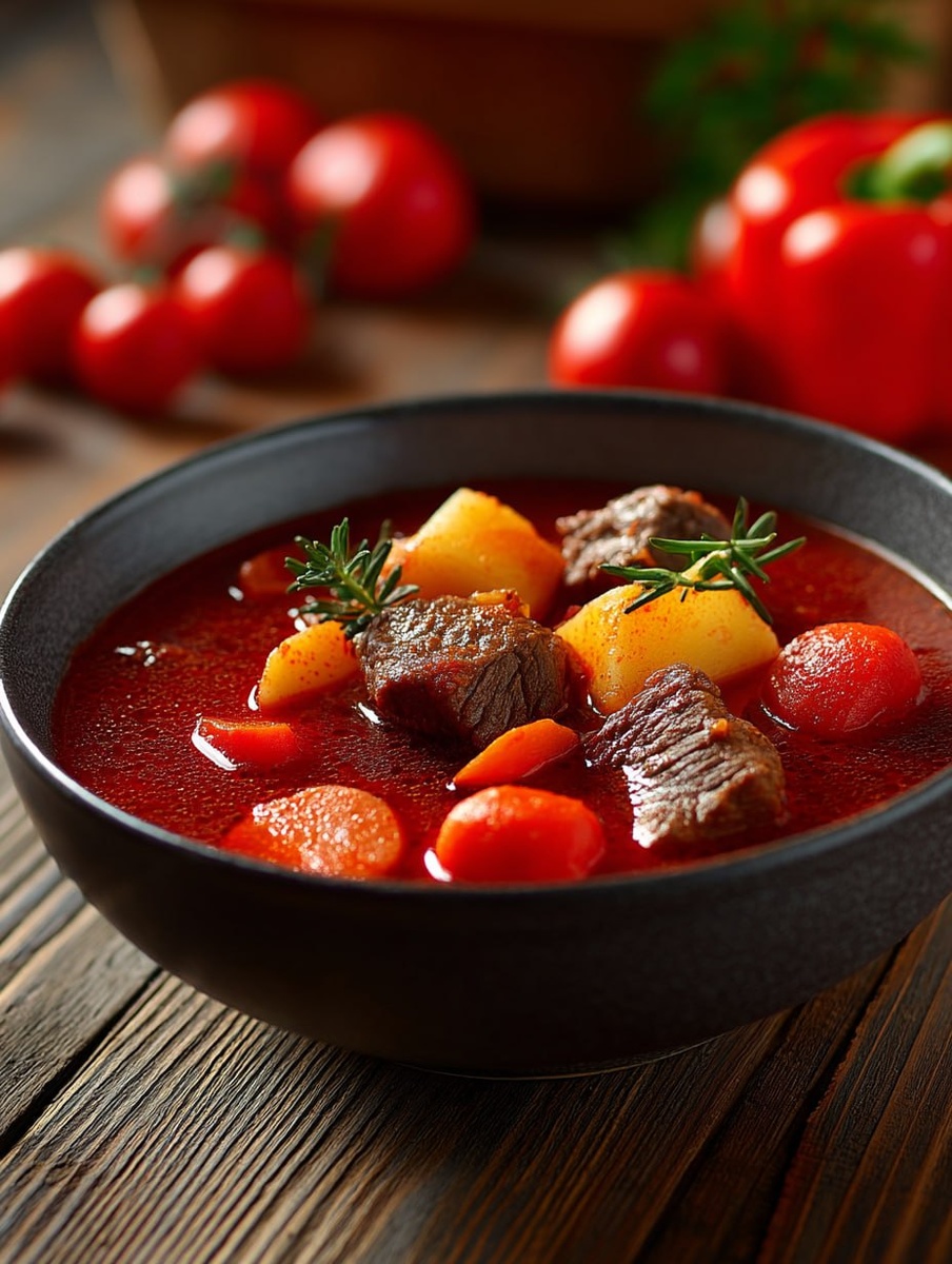 🕒 Время приготовления: 1 час 40 мин 🍽 Порций: 4 🔥 Калорийность: 489 кКал на порцию Настоящий венгерский гуляш из говядины — что-то вроде густого мясного супа, красивого насыщенного цвета, обязательно с паприкой, большим количеством мяса и овощами. 🧂 Вам понадобится: Лук репчатый (100 г) — 1 шт. Смалец — 40 г Паприка молотая — 4 ч. л. Говядина духовая — 600 г Соль морская — 1 ч. л. Перец чёрный молотый — ½ ч. л. Морковь — 200 г Перец сладкий красный (паприка) — 1 шт. Помидоры красные — 150 г Чеснок (дольки) — 4 шт. Картофель — 500 г 👩🍳 Приготовление 1️⃣ этап Ингредиенты 1-го этапа: Лук репчатый (100 г) — 1 шт. Смалец — 40 г Обжарьте некрупно нарезанный лук до золотистого цвета. 2️⃣ этап Ингредиенты 2-го этапа: Паприка молотая — 4 ч. л. Когда лук зазолотится, положите паприку. 3️⃣ этап Хорошо перемешайте, чтобы паприка равномерно соединилась с жиром. 4️⃣ этап Ингредиенты 4-го этапа: Говядина духовая — 600 г Соль морская — 1 ч. л. Перец чёрный молотый — ½ ч. л. Через пару
