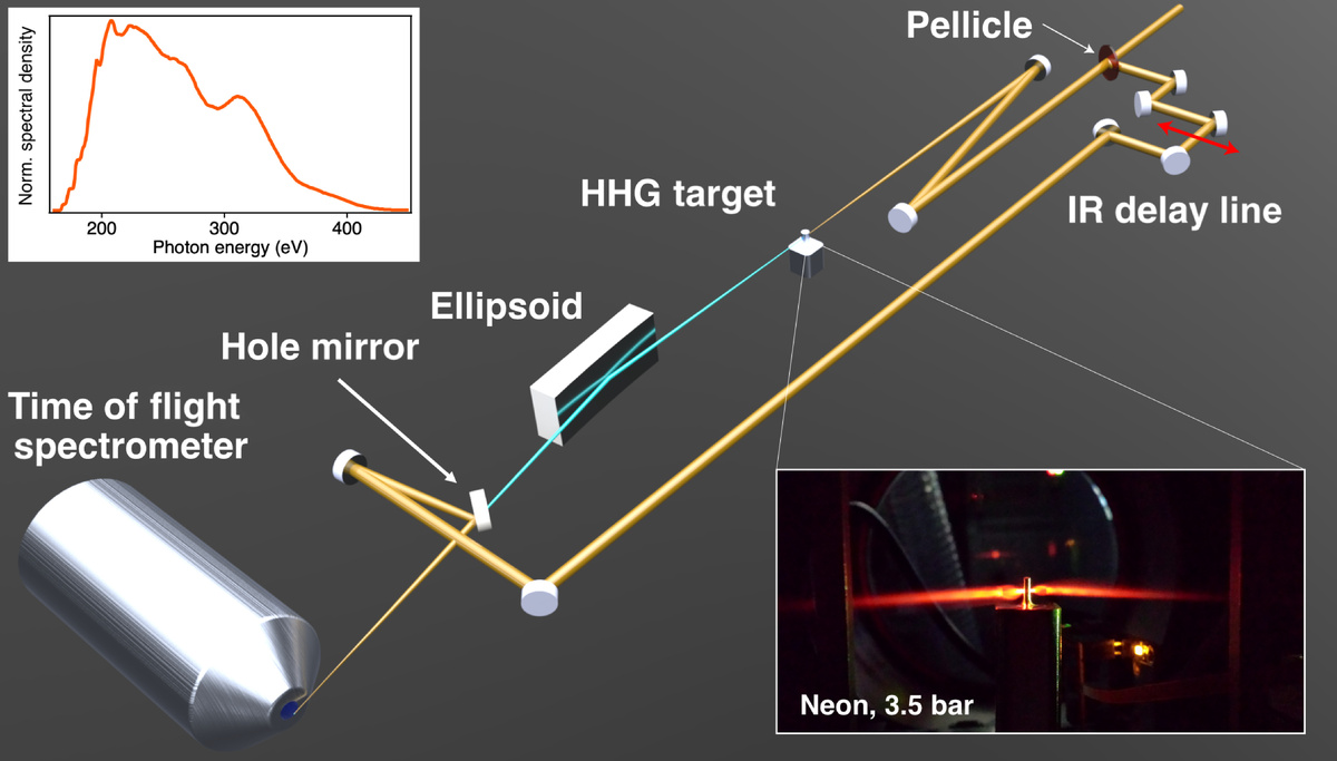 Возбуждение, рассеяние и релаксация электронов — важнейшие процессы, определяющие взаимодействие материи со светом. Их временные параметры влияют на образование или разрыв химических связей, движение заряда и энергии, а также на свойства молекул и материалов. Понимание этой динамики требует аттосекундного разрешения, поскольку электронные возбуждения и динамика [ 1 ] происходят в масштабах десятков аттосекунд [ 2 ]. С момента первого наблюдения в реальном времени фемтосекундного времени жизни вакансии M-оболочки в криптоне в 2002 году [ 3 ], аттосекундная наука позволила провести новаторские исследования электронного туннелирования [ 4–7 ] , фотоэмиссии [ 8–12 ], сверхбыстрого переноса заряда в молекулах [ 13–17 ] , локализации электронов [ 18–21 ] , электронной динамики [ 22–28 ] и многочастичной динамики в конденсированном состоянии [ 29–31 ] .Расширение диапазона аттосекундных импульсов до мягкого рентгеновского излучения (SXR, >124 эВ) особенно эффективно, поскольку спектроскопия основных уровней обеспечивает специфичность элементов и селективность по месту расположения. Эта возможность позволяет проводить исследования внутриатомного и внутримолекулярного переноса энергии с аттосекундным разрешением [ 32–34 ] , структурных перестроек , вызванных зарядом [ 35 , 36 ], переходных изменений химической реактивности [ 37 ], неадиабатической динамики [ 38–40 ], фотоповреждения органических веществ [ 41 ] , а также динамики носителей и экситонов [ 23 , 29 , 42 ]. Важно отметить, что аттосекундные импульсы SXR позволяют получить доступ к основным краям поглощения типа ядро-оболочка, имеющим решающее значение для химии, биологии и органической электроники, таким как K-края углерода, азота и кислорода, тем самым предоставляя новый однозначный способ исследования сложных многочастичных взаимодействий между фотонами, носителями заряда и ядрами [ 29 , 30 , 43 ].За последнее десятилетие коротковолновые и средневолновые инфракрасные излучатели продвинули генерацию высоких гармоник (ГВГ) [ 44 , 45 ] в диапазон SXR [ 46–51 ]. Ранние исследования ГВГ с использованием Ti:сапфировых лазеров доказали возможность генерации фотонов с энергией в кэВ [ 52 ] , хотя и с крайне низкой эффективностью. Только пондеромотивное масштабирование ГВГ [ 53 ] с помощью излучателей большей длины волны позволило добиться гораздо более эффективной генерации фотонов в водном окне (от 284 до 530 эВ; [ 49 ] ) и вплоть до диапазона кэВ [ 36 ]. Для достижения этой цели потребовался существенный прогресс [ 49 , 54 ] для преодоления неблагоприятного масштабирования длины волны отклика отдельных атомов (λ −5 до λ −9 ) [ 55–57 ] путем понимания динамики ионизации при беспрецедентных давлениях газа [ 48 , 54 , 58 ] для достижения эффективного фазово-согласованного генерации высоких гармоник [ 59–62 ]. Это понимание потребовало взаимодействия при давлениях от нескольких до десятков бар, которые могут быть получены с помощью капилляров или тщательно разработанных целевых систем , поддерживающих стабильные, эффузивные газовые мишени. Эти инновации открыли долгожданные новые возможности, такие как первая когерентная спектроскопия SXR [ 24 , 47 , 63 ]. Одновременно с этими достижениями, генерация высоких гармоник в диапазоне SXR привела к ожиданиям генерации еще более коротких, изолированных аттосекундных импульсов [ 64–69 ] , что столкнулось с новыми