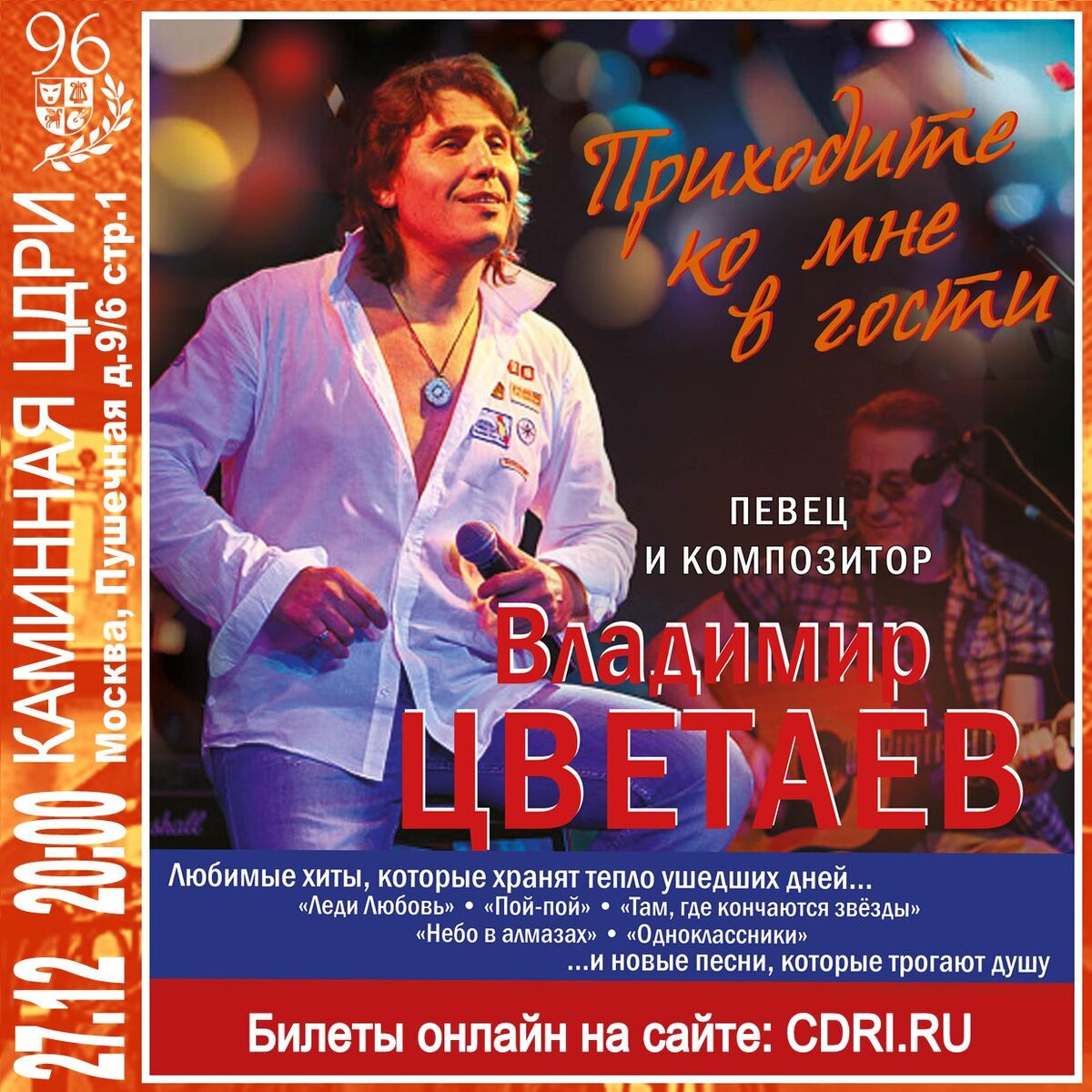«Приходите ко мне в гости» Владимир Цветаев Новогодний вечер за столиками уютной Каминной ЦДРИ певца и композитора Владимира Цветаева Любимые хиты, которые хранят тело ушедших дней…