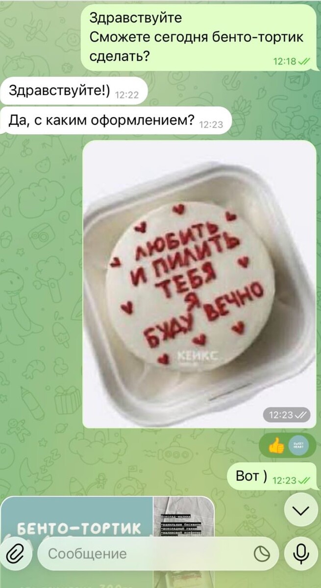 Я устала уже читать истории заказчиков, это какая-то шиза - хотеть картины Ван Гога и Пикассо на площади в 10 см. Ниже пример того, как я заказываю бенто-торты: Вот вам фотка. Сделайте текст черным, сердечки красным. Всё, спасибо, досвидули, спасибо, получили. Даже если бы было бы что-то не то, я бы не расстроилась. Это не торт от Рината Агзамова на 200 человек). Господа, нужно быть проще - и мир к Вам потянется. ❓ Чья позиция вам ближе: автора, который хочет "проще", или заказчиков, которые хотят "шедевры на 10 см"? Почему? ❓ Приходилось ли вам сталкиваться с подобными ситуациями в роли заказчика или исполнителя? Поделитесь своей историей. ❓ Автор говорит: "Даже если бы было бы что-то не то, я бы не расстроилась". А вы часто расстраиваетесь, когда результат услуги не идеально совпадает с ожиданиями? От чего это зависит? ❓ Как вы обычно формулируете заказы или просьбы: детально и подробно (как "заказчики картин") или коротко и по делу (как автор с тортом)? Если у вас ест