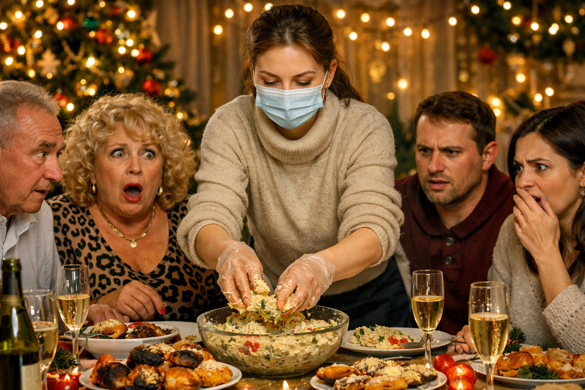 Невестка суетилась у плиты без перчаток, без спешки, накладывала еду щедро и старательно. При этом несколько раз кашлянула, снова чихнула, вытерла нос салфеткой и тут же продолжила накладывать салат. Никакой демонстративной грубости — только подчёркнутая «естественность». Она даже извинилась: мол, грипп совсем выбил из колеи, тесто сегодня не удалось, выпечка получилась странная, но «что вышло, то вышло».