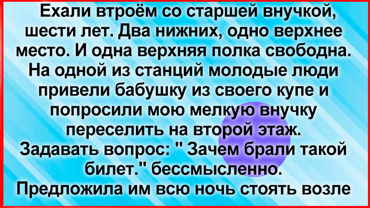 Ехали втроём со старшей внучкой, шести лет. Два нижних, одно верхнее место. И одна верхняя полка свободна. На одной из станций молодые люди привели бабушку из своего купе и попросили мою мелкую внучку переселить на второй этаж.