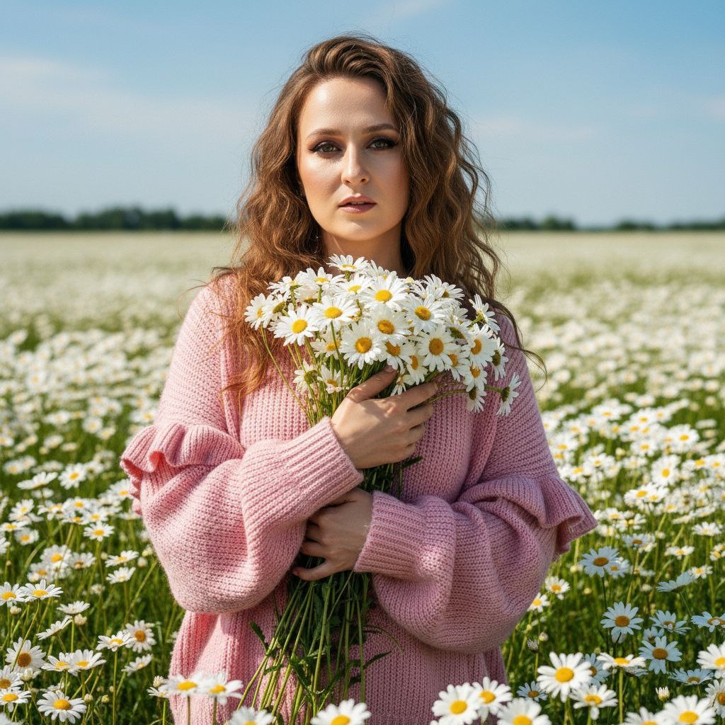 На ней объемный светло-розовый вязаный свитер с оборками на рукавах. Она держит большой букет свежих ромашек близко к груди. Ее волосы уложены мягкими, объемными каштановыми волнами. Макияж мягкий и матовый, нейтральные тона. Освещение яркое, создающее мягкое сияние. Мягкий фокус на фоне (боке) цветочного поля под ясным голубым небом. Разрешение 8K, фотореалистичная, высокодетализированная текстура кожи, профессиональная фотосъемка. «Убедитесь, что лицо выглядит как человек на предоставленном изображении» 👉Все ссылки ТУТ 👉канал в Дзен 💰Donate