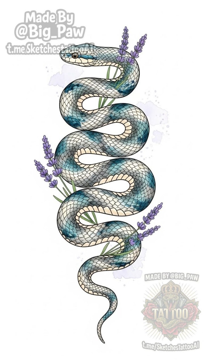 : Змея с веточкой лаванды, на предплечье девушке с выходом на плечо, вертикальный формат. Легкая, не агрессивная. Планируется чб+акварель, цвета как у змеи на референсе. Положение головы как на двух картинках-референсах. Так же на фото пример чешуи. Лаванда ненавязчивая, ее не много, дополняет картину и вписана в общую композицию. 🧠 SYNTX - тут создан эскиз 💎 Информация - все услуги 💀 Эскизы от нейросети #змея #наруку #цветы #эскиз #тату #татуировка