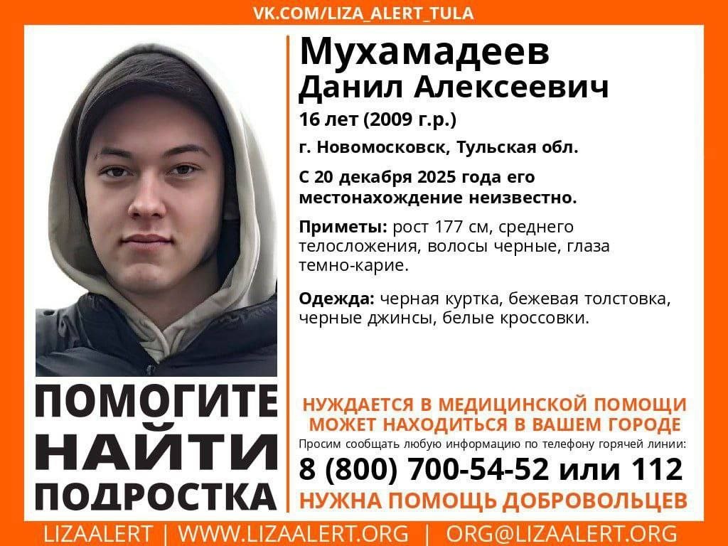 Ищут: Мухамадеев Данил Алексеевич, 16 лет Пропал: 20 декабря 2025 года, г. Новомосковск Инфорг: Ольга (Малина) — 8-926-009-31-93 Любую информацию о местонахождении Данила просьба сообщать по указанному номеру или в службу 112. Актуальные новости в Тула Шум.
